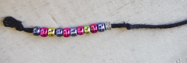 You can check out the proof-of-concept Twine here. Rather than using the bead apparatus (below), you can click on the links in the story or use the number keys on your computer’s keyboard as follows: magenta- 1; bronze- 2; gold- 3; green- 4; purple- 5; silver- 6.