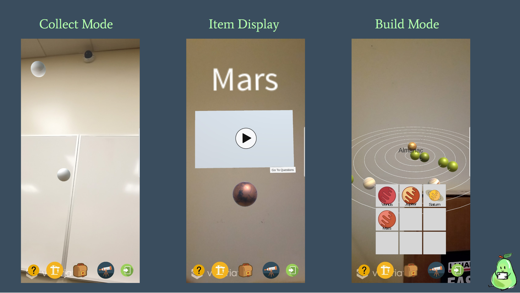 This project is an early proof-of-concept developed with students from UCF’s Capstone Computer Science class. Designed to experiment with the capabilities of augmented reality to engage and educate youth (late elementary to early high school age), PEAR superimposes planets that players “gather” by tapping their phone screen. Once a planet is gathered, the player learns about it by watching a video and testing their knowledge by answering multiple-choice questions about the planet. If enough questions are answered correctly, the planet is unlocked (it appears in its natural color rather than a plain gray orb) and the player places it in its correct location in the solar system (superimposed on the player’s existing environment).